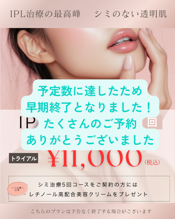 2026年4月10日 シミ治療,新着情報 【IPL光治療(ICON)トライアル終了のお知らせ📣】 いつも当院をご利用いただきありがとうございます🌸 ご好評につきIPL光治療(ICON)トライアルは 予定数に達したため、早期終了となりました👏🏻 たくさんのお問い合わせ・ご予約をいただき、誠にありがとうございました🙇🏻♂️ 今後のお得な情報もぜひご期待ください🍒